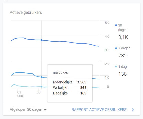 * Op dit plaatje van Google analytics is goed te zien hoe de frequentie van het aantal bezoekers per dag fluctueert. Vandaag 29 december (de dag is nog niet om) is het aantal van gisteren gemeten en dat zijn 138 unieke (lees verschillende) bezoekers. Toevallig raakte ik met mijn muis bij de schermfoto ook maandag 9 december aan. Je ziet dat er toen 169 bezoekers waren.
